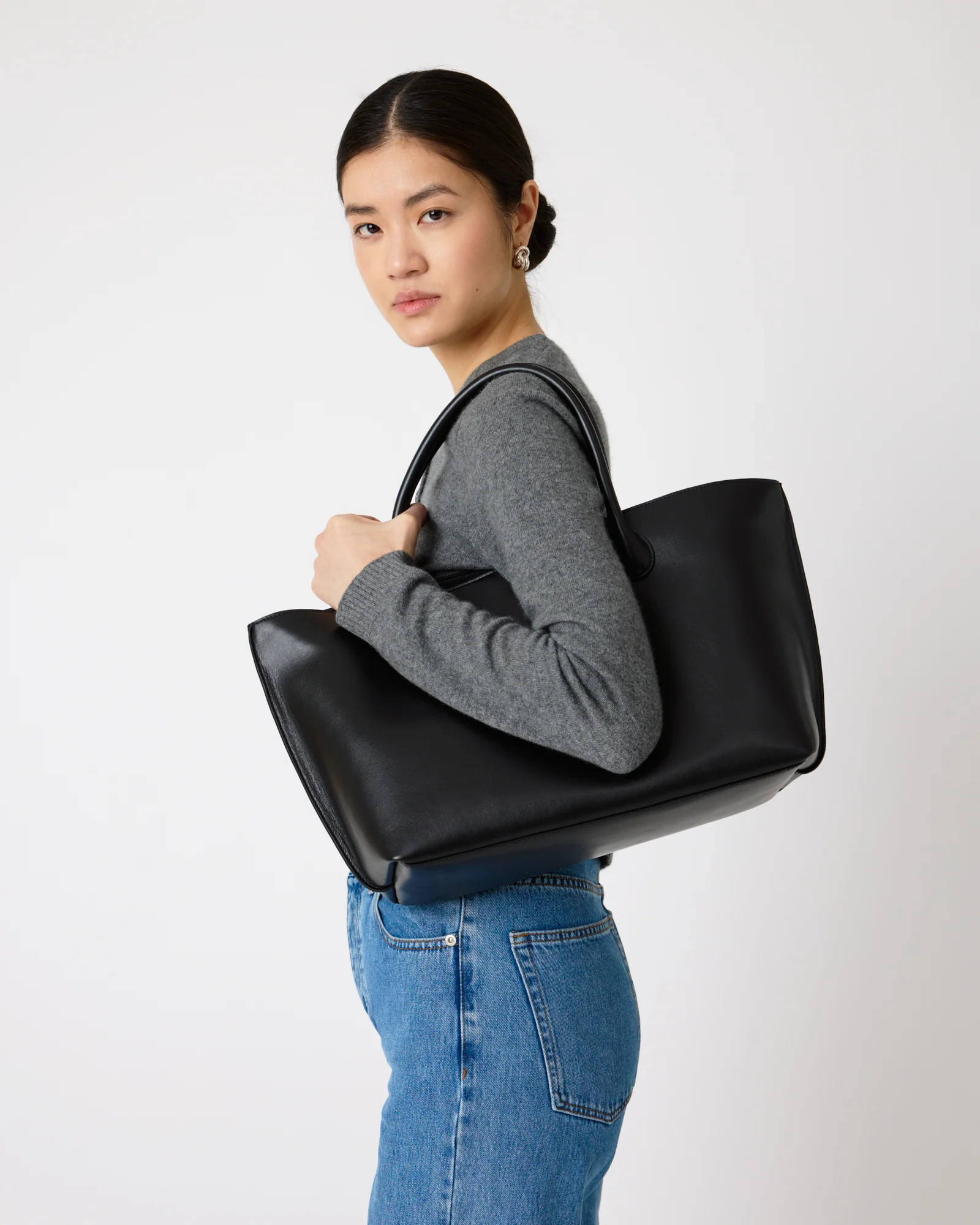A refined reinterpretation of our signature Eva Weekend Tote, the Grace Tote in solid black offers the same softly structured silhouette in a more compact, everyday size. Its rounded handles and spacious interior make it an effortless companion from morning to evening.