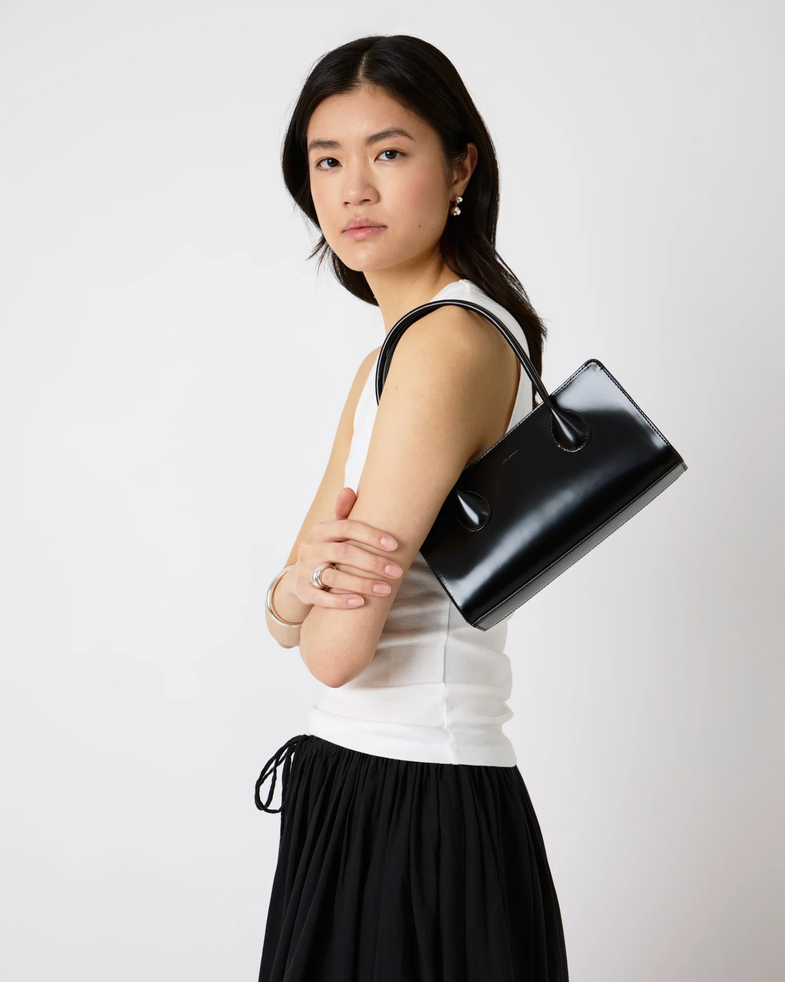 A modern evening bag with a nostalgic spirit, the Lou Bag is a refined take on the classic top-handle silhouette. Crafted from sleek leather in a softly structured shape, it’s designed to hold your evening essentials with ease. Discreet yet distinctive, it adds just the right amount of polis. Whether paired with tailoring or a slip dress, it completes the look with understated elegance.